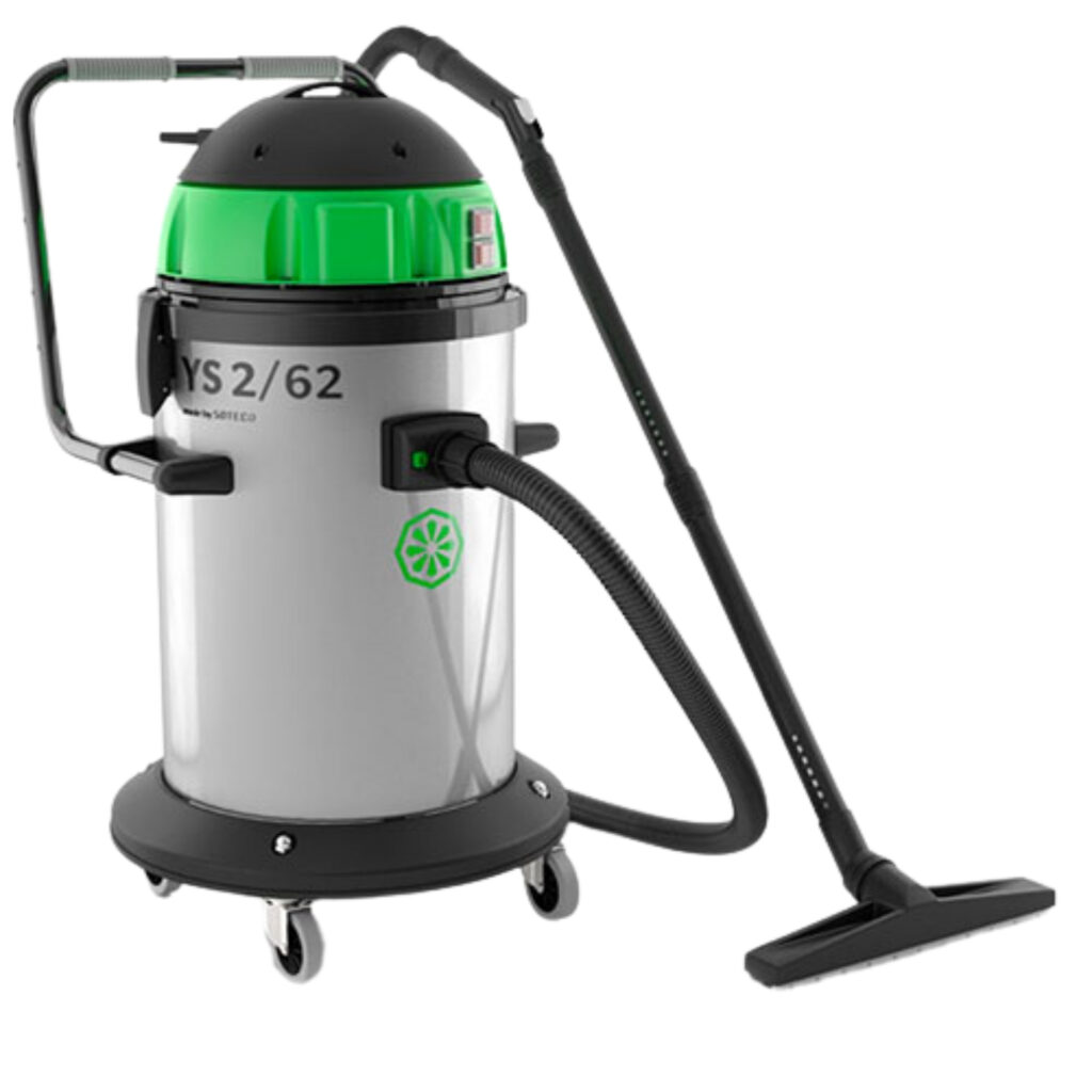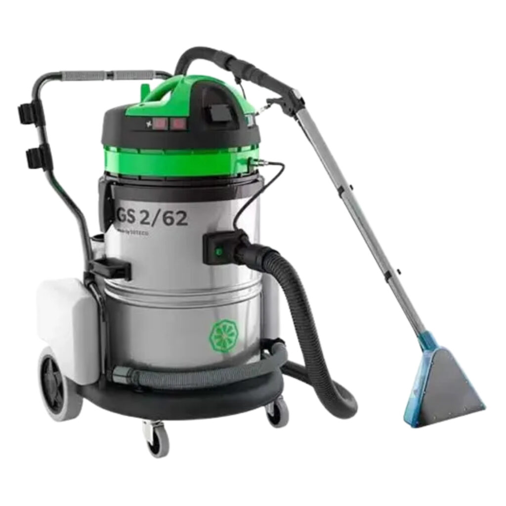 GS 2/62 EXT es extremadamente sólido gracias al amplio carro integrado con un recipiente de detergente y tanque de acero inoxidable de 62 litros. Es capaz de aspirar sin parar polvo, suciedad y líquidos de superficies rellenas, interiores de automóviles y grandes superficies, lo que lo hace ideal para empresas de lavado de autos.
